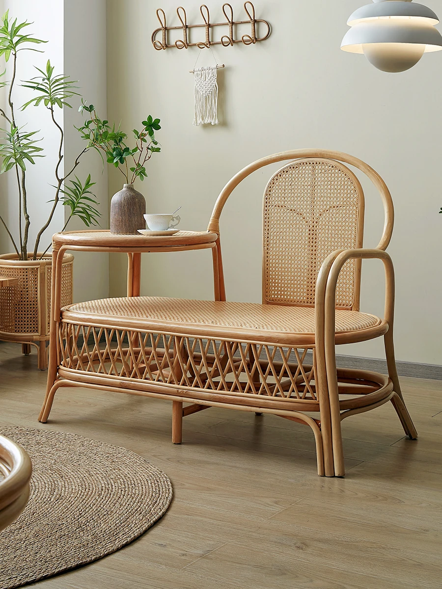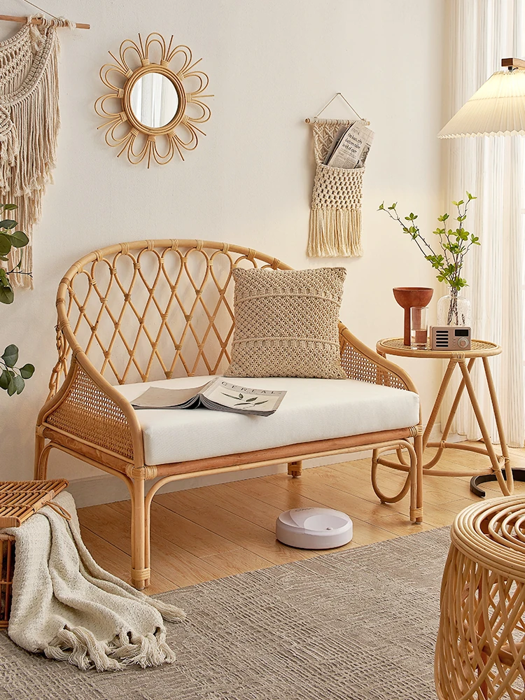 北欧風のラタン編みインス風バルコニー用ダブルソファ - レトロなデザインで居心地抜群!モダンなミニマリズムを取り入れたリビングやゲストハウスに最適なソファチェア。