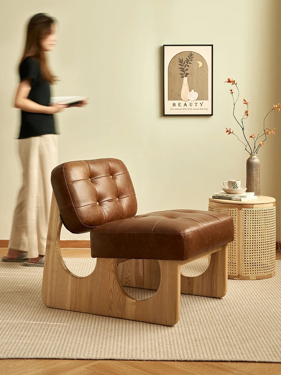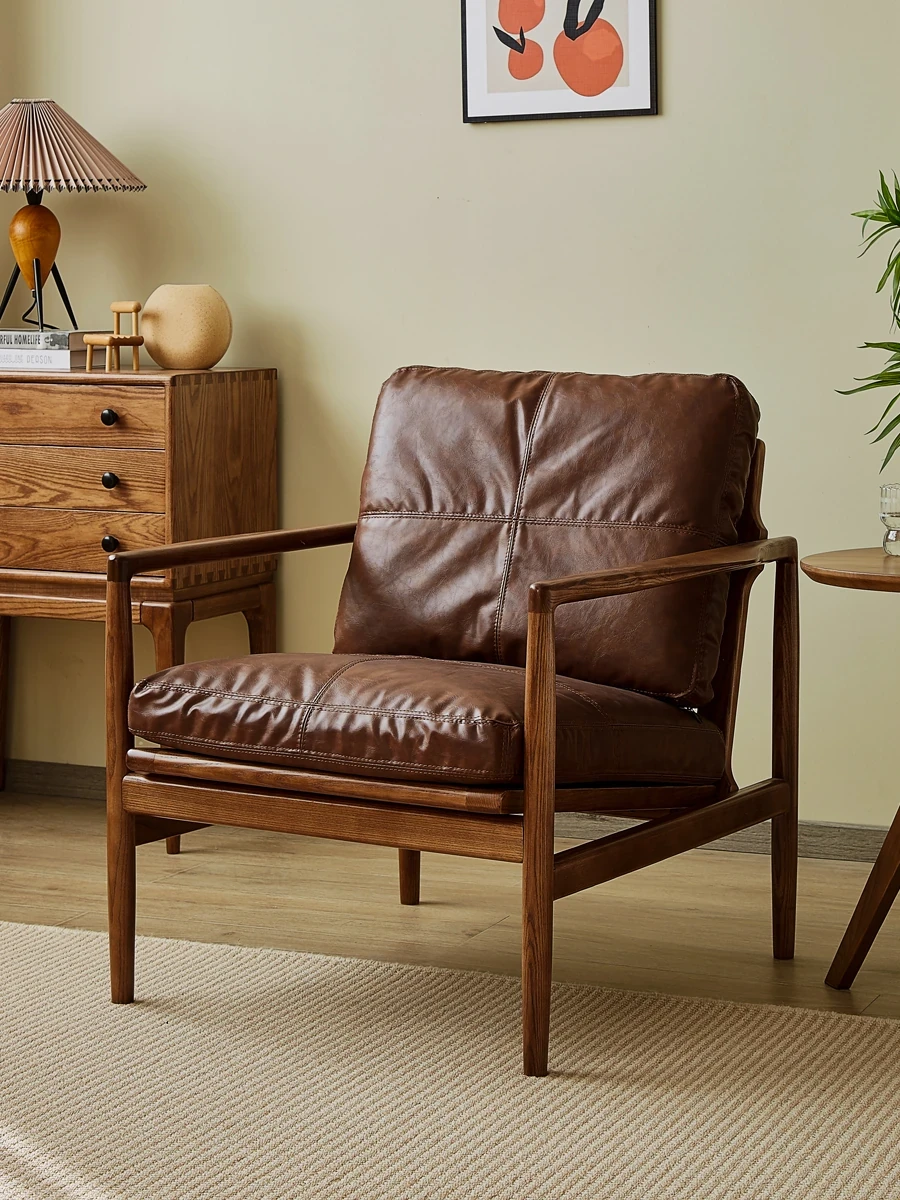 中式レトロ本革製ウッドソファチェア - スタイリッシュなミニマリスト一人用リラックスチェア、コンパクトなリビングに最適!読書やくつろぎの時間にぴったりな組み合わせ。