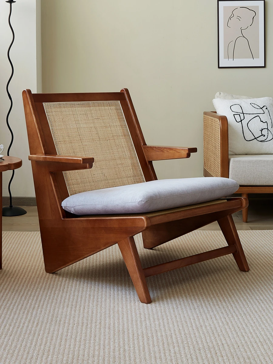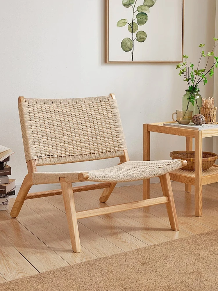 北欧インスパイアの天然木とラタン編みのリクライニングチェア - シンプルでスタイリッシュな一人掛けソファ、リラックスと読書に最適なデザイナーズアイテム!リビングやバルコニーにぴったり。