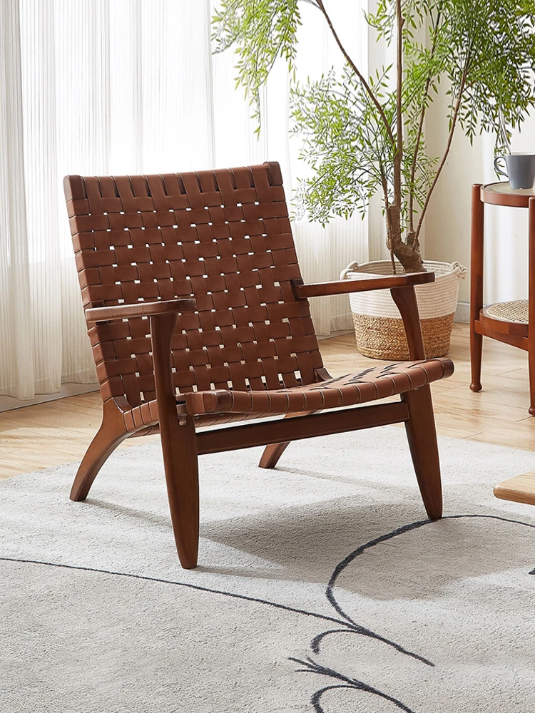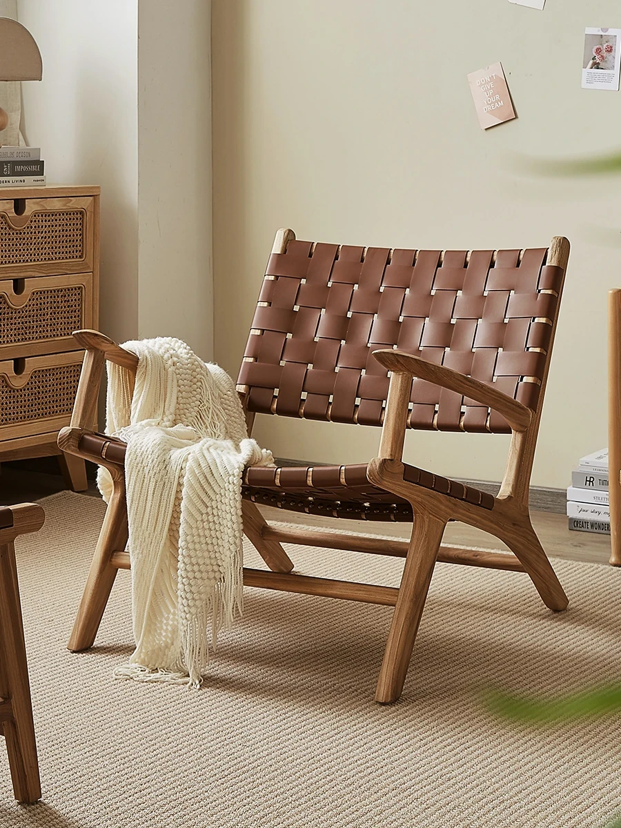 侘寂スタイルの本革と籐編みの一人掛けソファ、北欧デザインのシンプルでモダンなリラックスチェア。小さなスペースにもぴったり!おしゃれな客間を演出します。