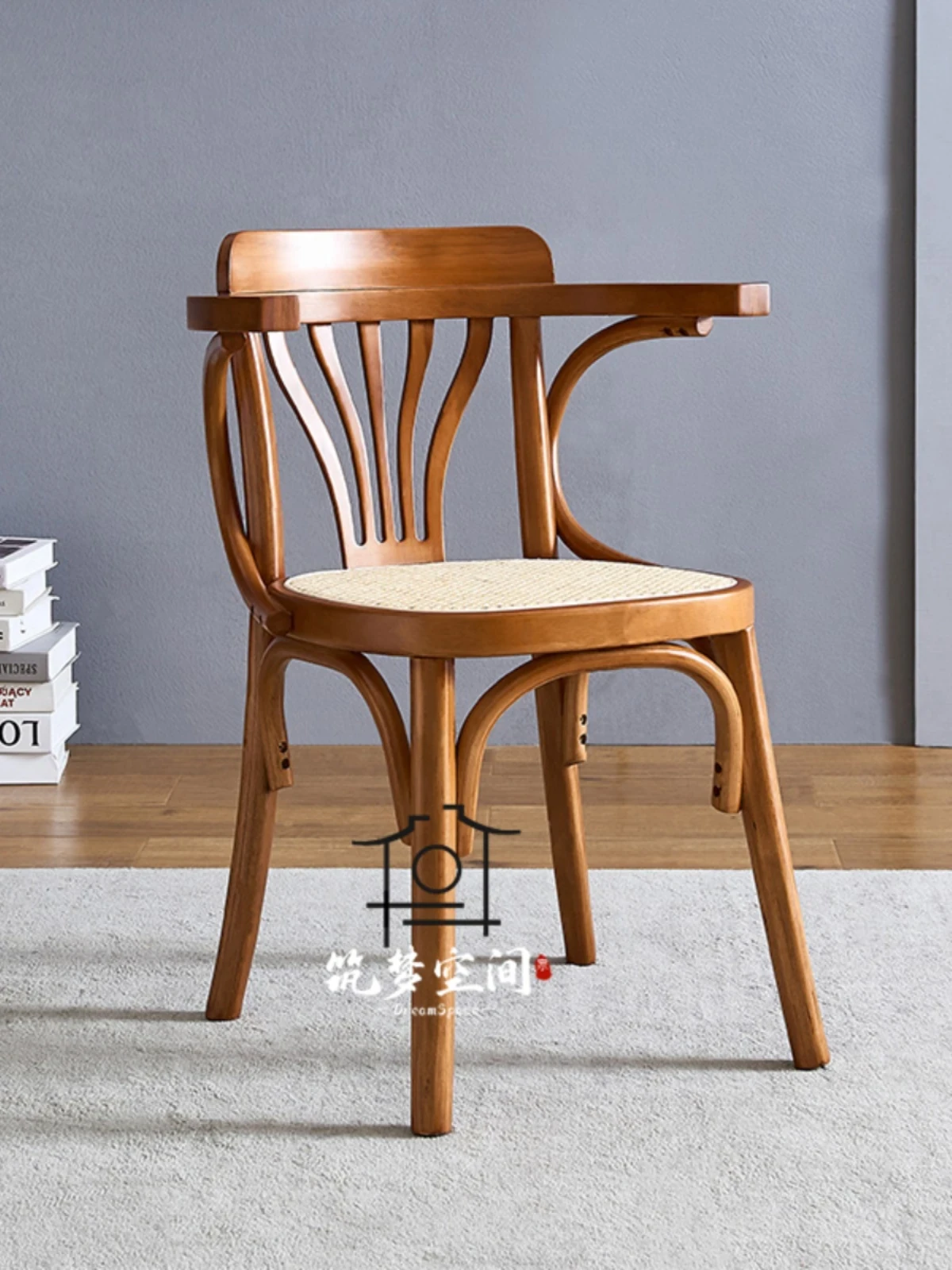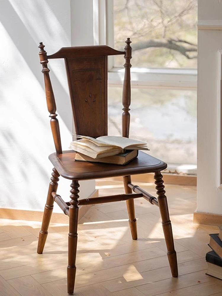 レトロな無垢材ダイニングチェア - 中古風の背もたれ付き椅子!寝室、書斎、カフェ、バルコニーにも最適なリラックスチェア。小スペースでも映えるおしゃれなデザインで、心地よいひとときを演出します。