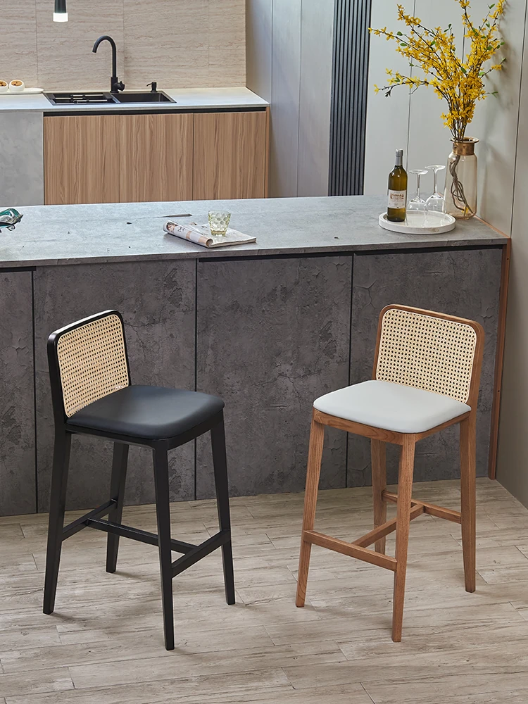 北欧スタイルのラタン編み木製バースツール | デザイナー背もたれ付き | ホワイトアッシュ材使用 | モダンミニマリストデザイン | 中古風のカフェチェアに最適!