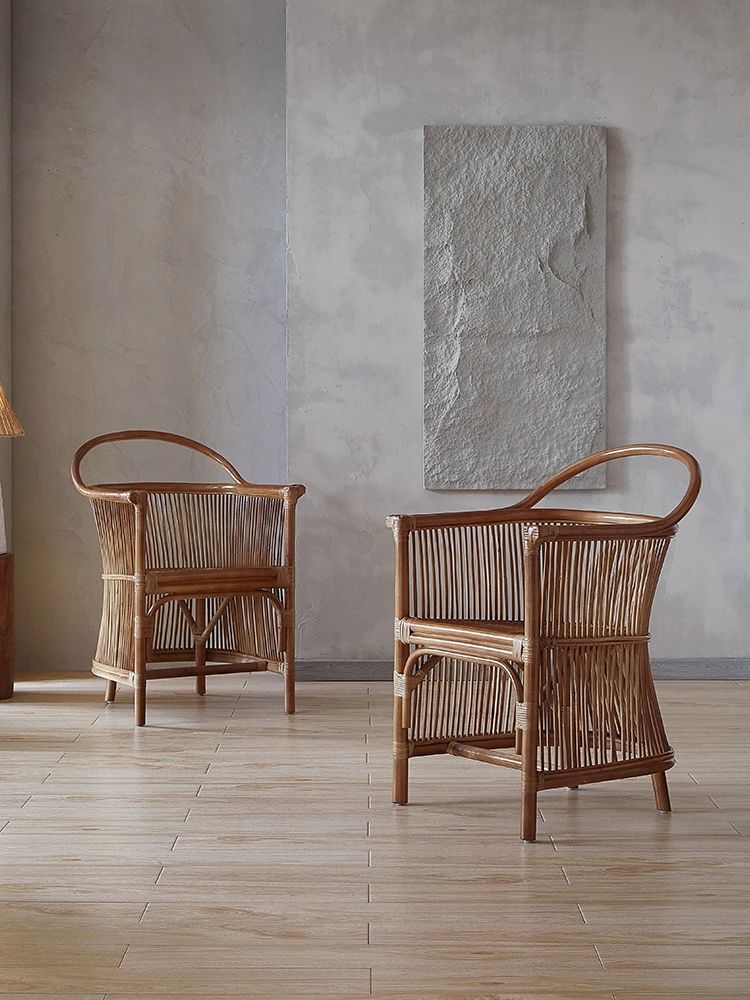 レトロな天然ラタン製ダイニングチェア|和風デザインのリラックスチェア|民宿や茶屋にぴったりな一人用ラタンチェア|心地よい座り心地とおしゃれなインテリアを実現!