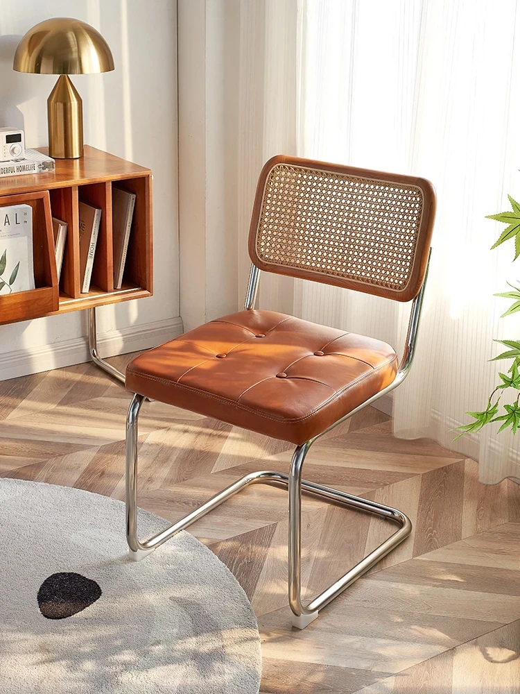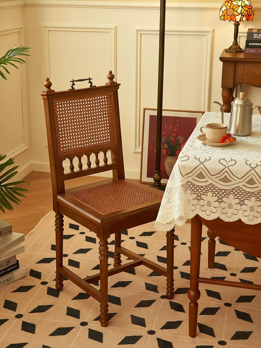 フレンチヴィンテージ天然木製ダイニングチェア | 籐編みデザイン | モダンミニマリストスタイル | リビングルームにぴったりのリラックスできる食事椅子 | 小さなスペースにも最適!