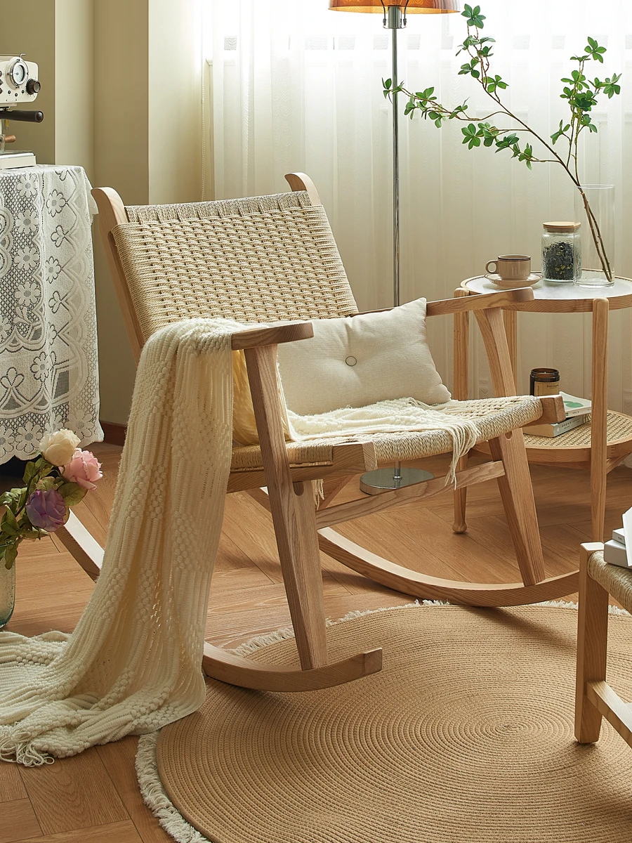 壹玖夢の空間 北欧スタイルの無垢材編み込みロッキングチェア 大人用バルコニー家庭用リラックス1人掛けソファーベッド