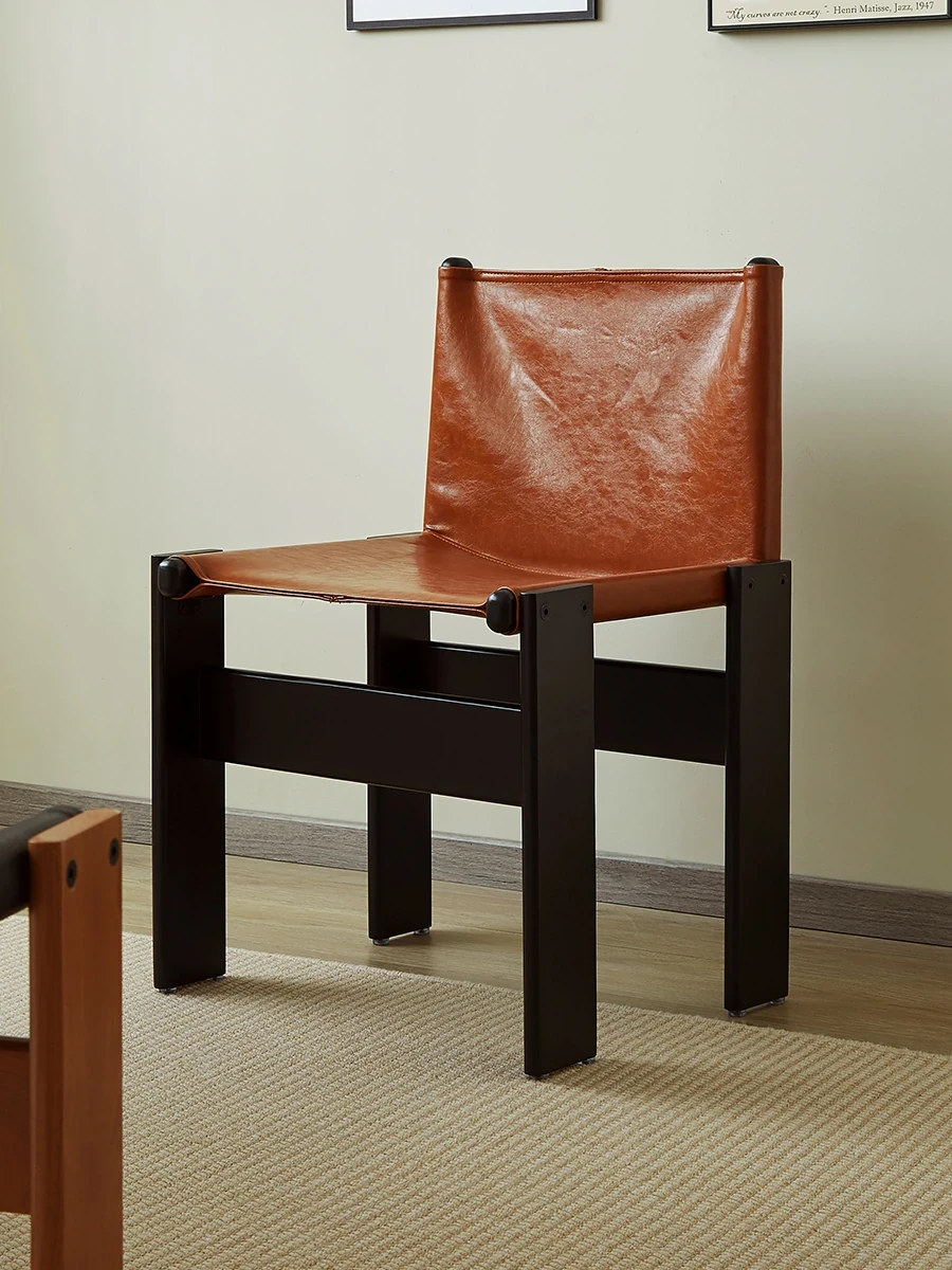 北欧ヴィンテージスタイルの木製ダイニングチェア、レザー背もたれ付き。侘寂のデザインで、モダンでシンプルな空間にぴったり!小さな家にも最適なリラックスチェア。