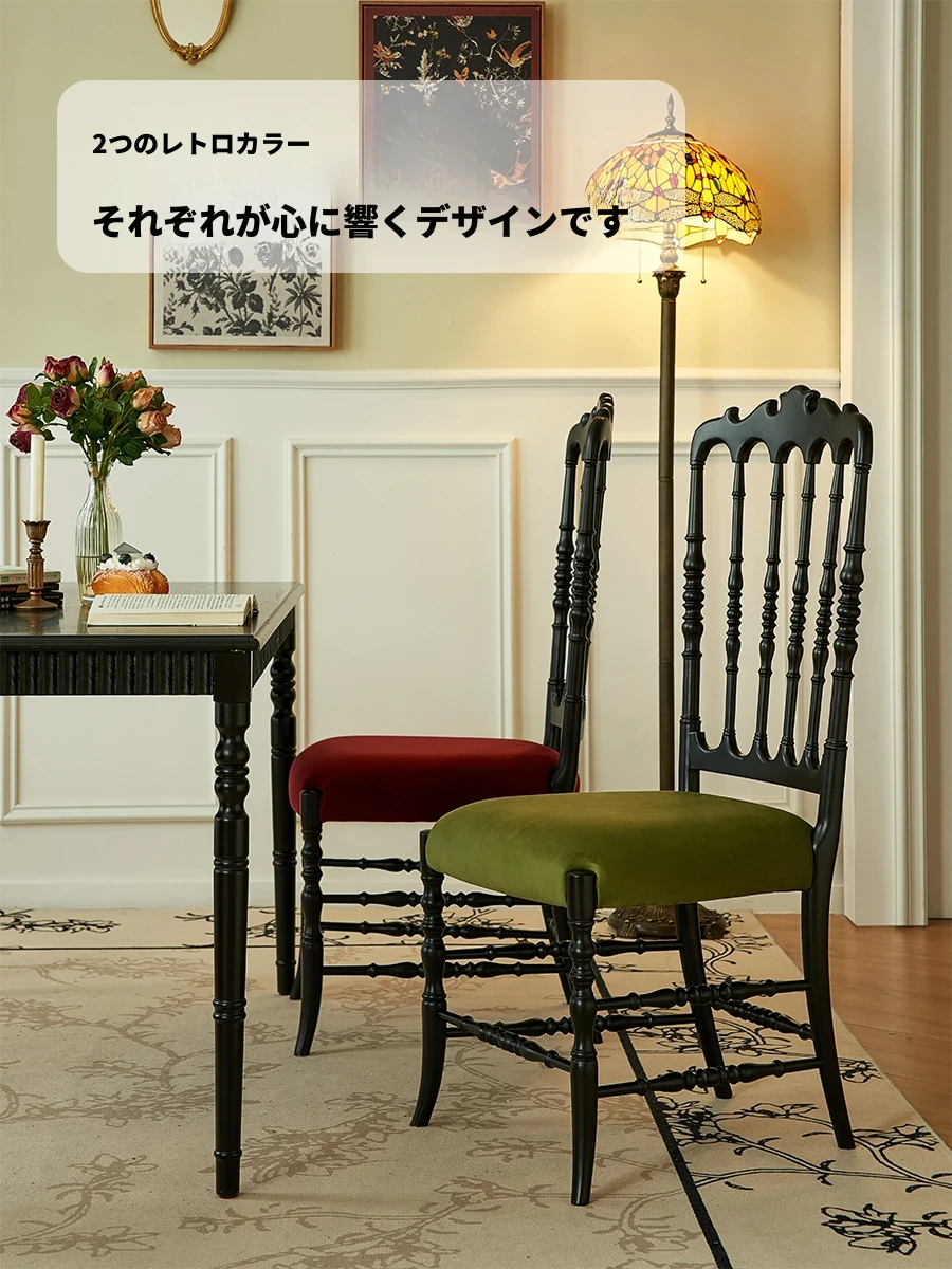 フレンチスタイルの無垢材ダイニングチェア!デザイナーによる柔らかいファブリッククッション付き。ヴィンテージ感漂う高級感あふれる背もたれ椅子。おしゃれで快適な食卓を演出します!