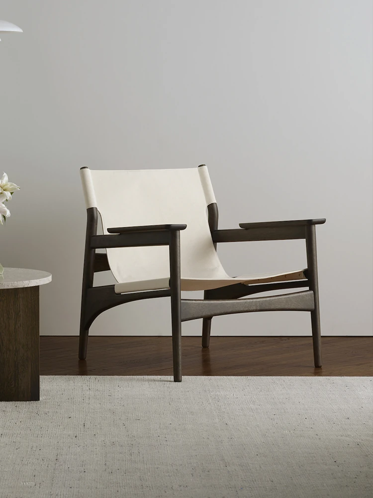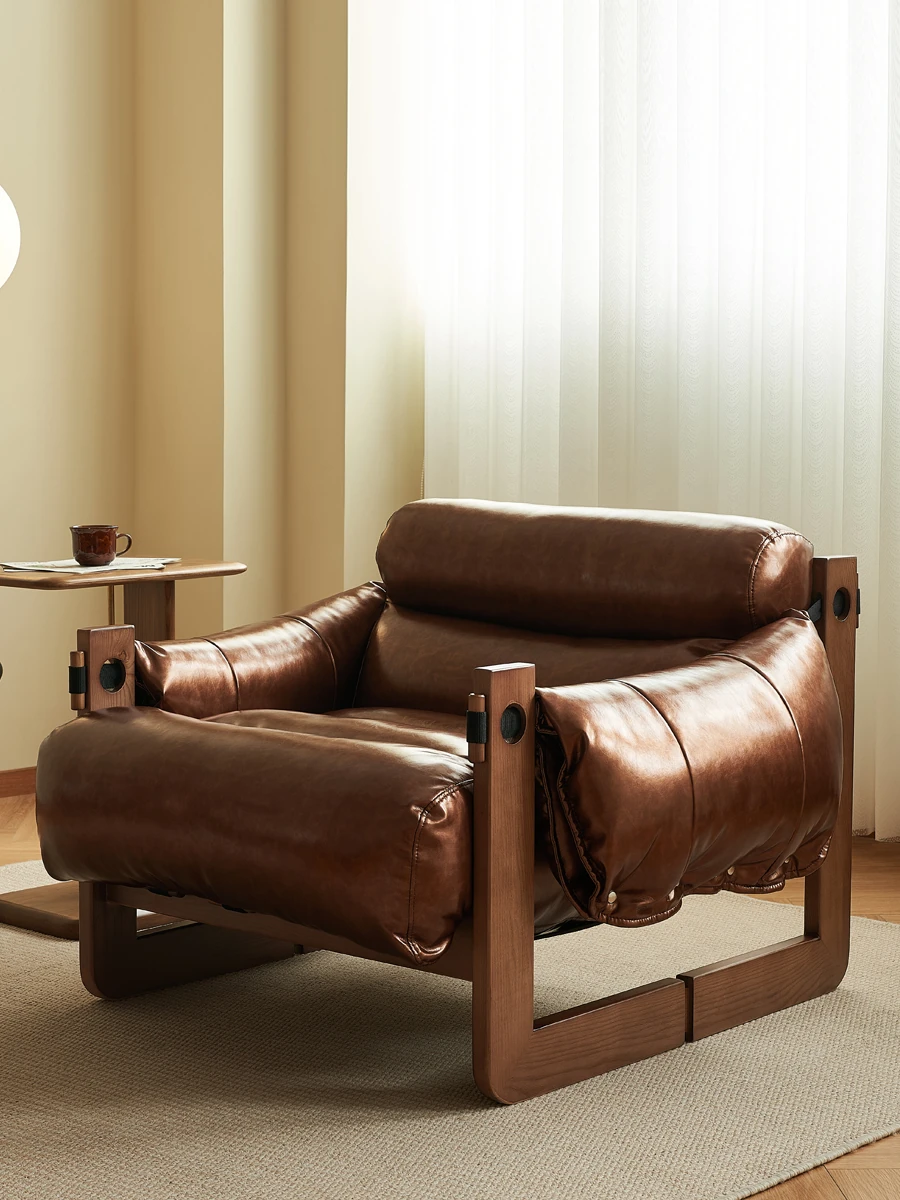 Nordic Retro Solid Wood Armchair - Designer Lounge Chair with Real Leather, Minimalist Modern Style for Small Spaces, Perfect for Your Living Room
