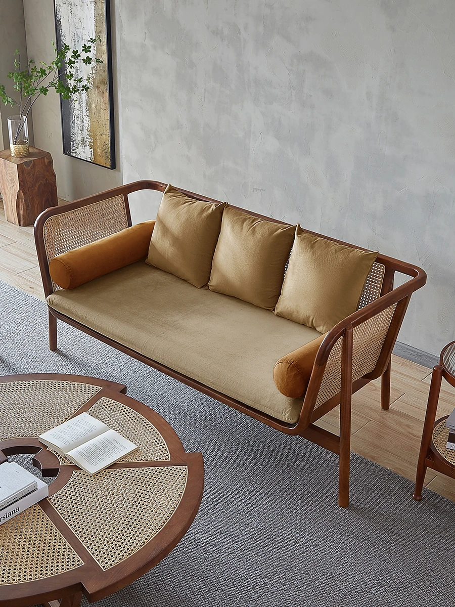 Japanese Retro Rattan-Woven Wooden Sofa - Modern Minimalist Solid Wood Three-Person Set for Small Spaces, Featuring Cozy Velvet Fabric for Comfort