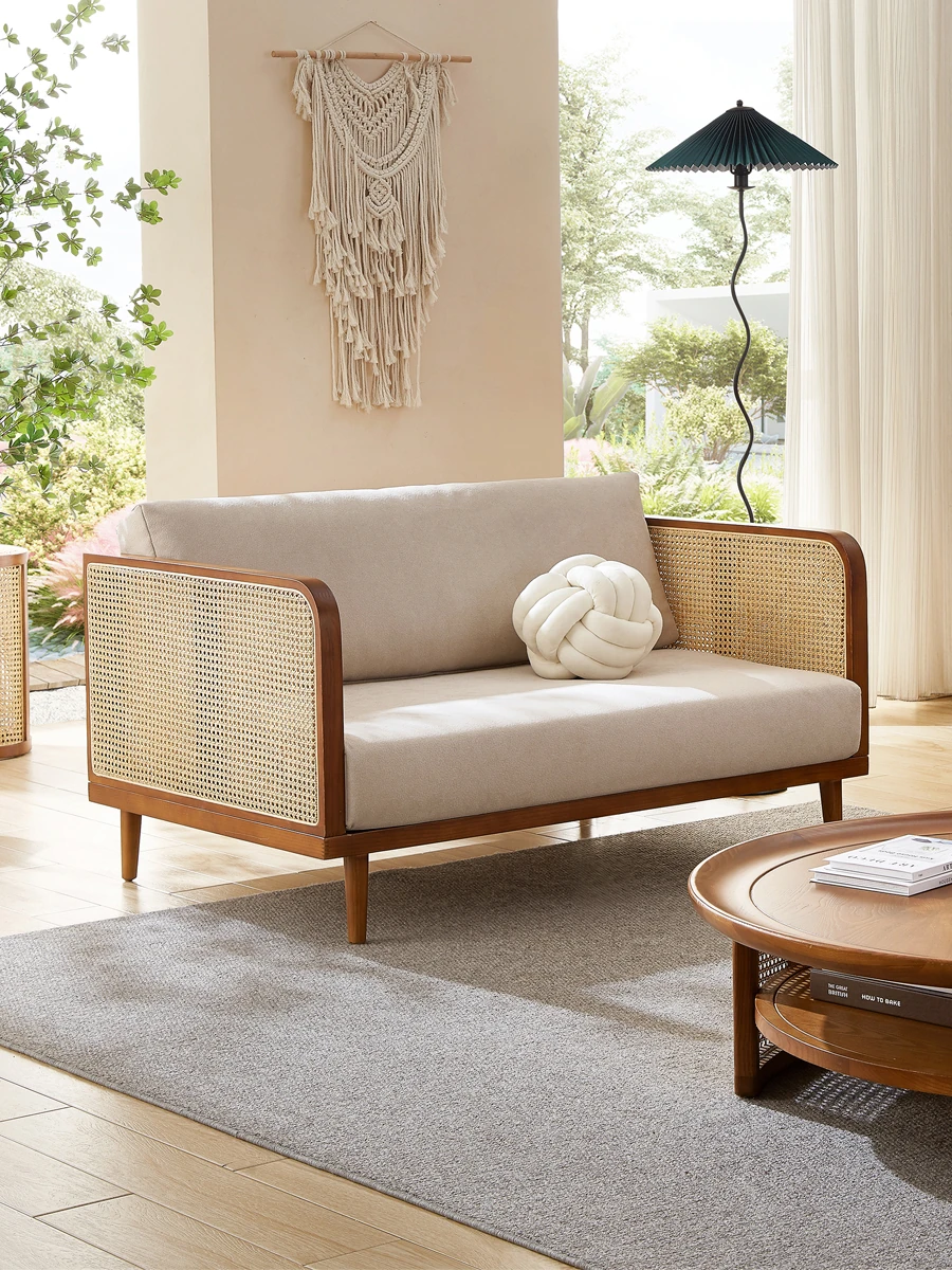 Vintage Chinese Fabric Sofa - Modern Minimalist Rattan and Solid Wood Double Three-Seater for Living Room, Perfect for Small Spaces