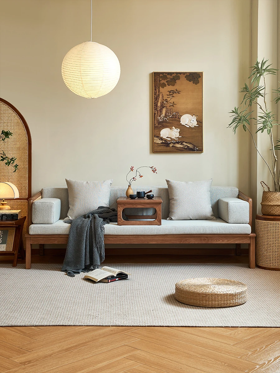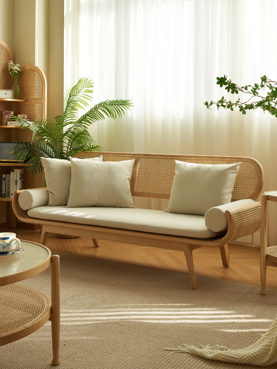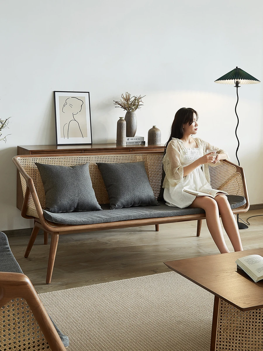 Yijiu Dream Space Designer's Japanese-Style Solid Wood Rattan Sofa and Coffee Table Set for Small Living Rooms – Perfect for Cozy Spaces