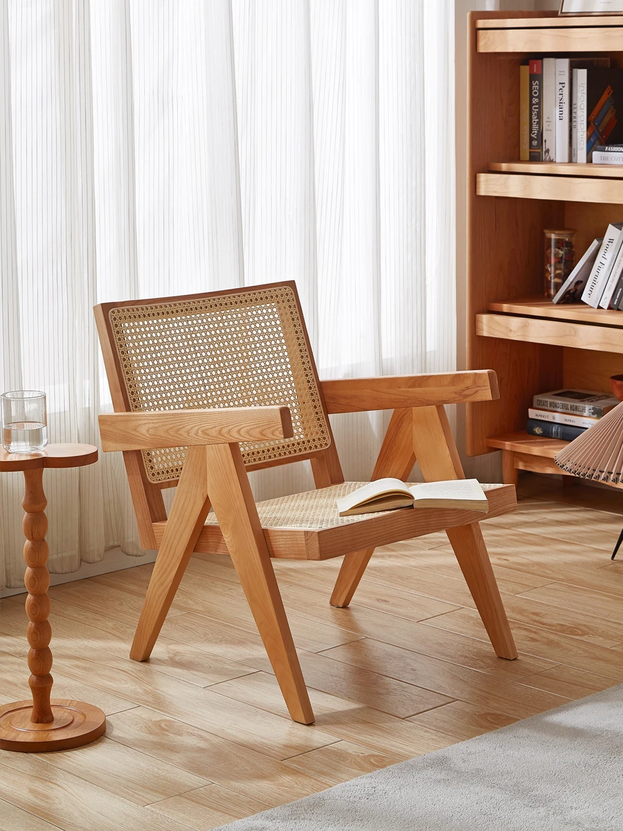 Wabi-Sabi Style Solid Wood Rattan Single Leisure Sofa Chair - Scandinavian Minimalist Design for Small Spaces, Perfect for Your Living Room