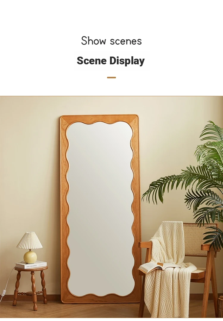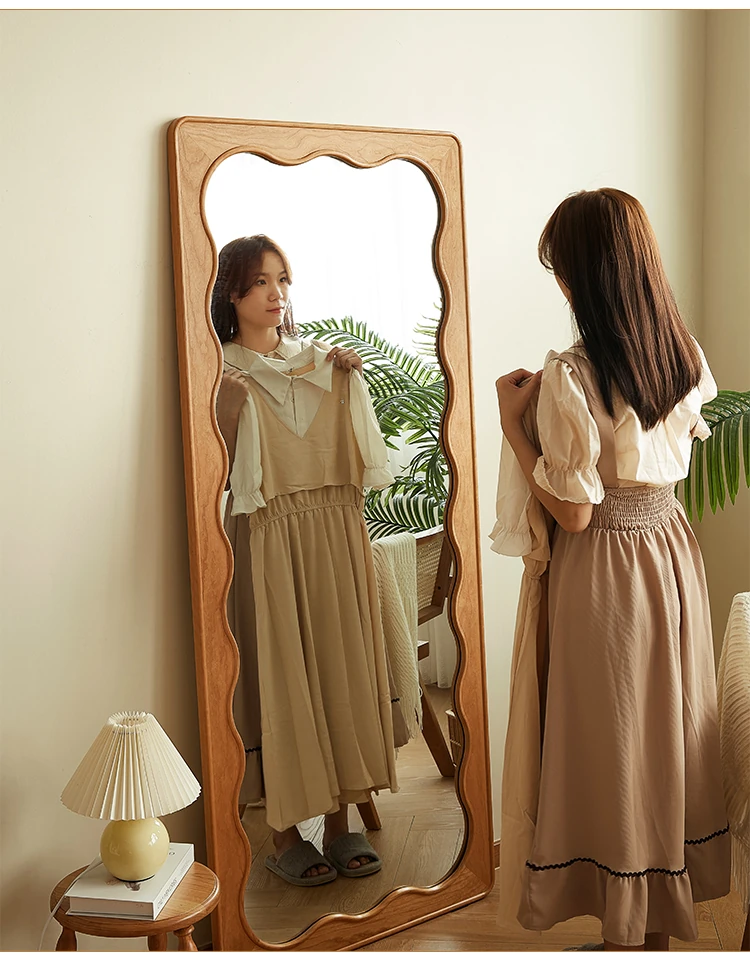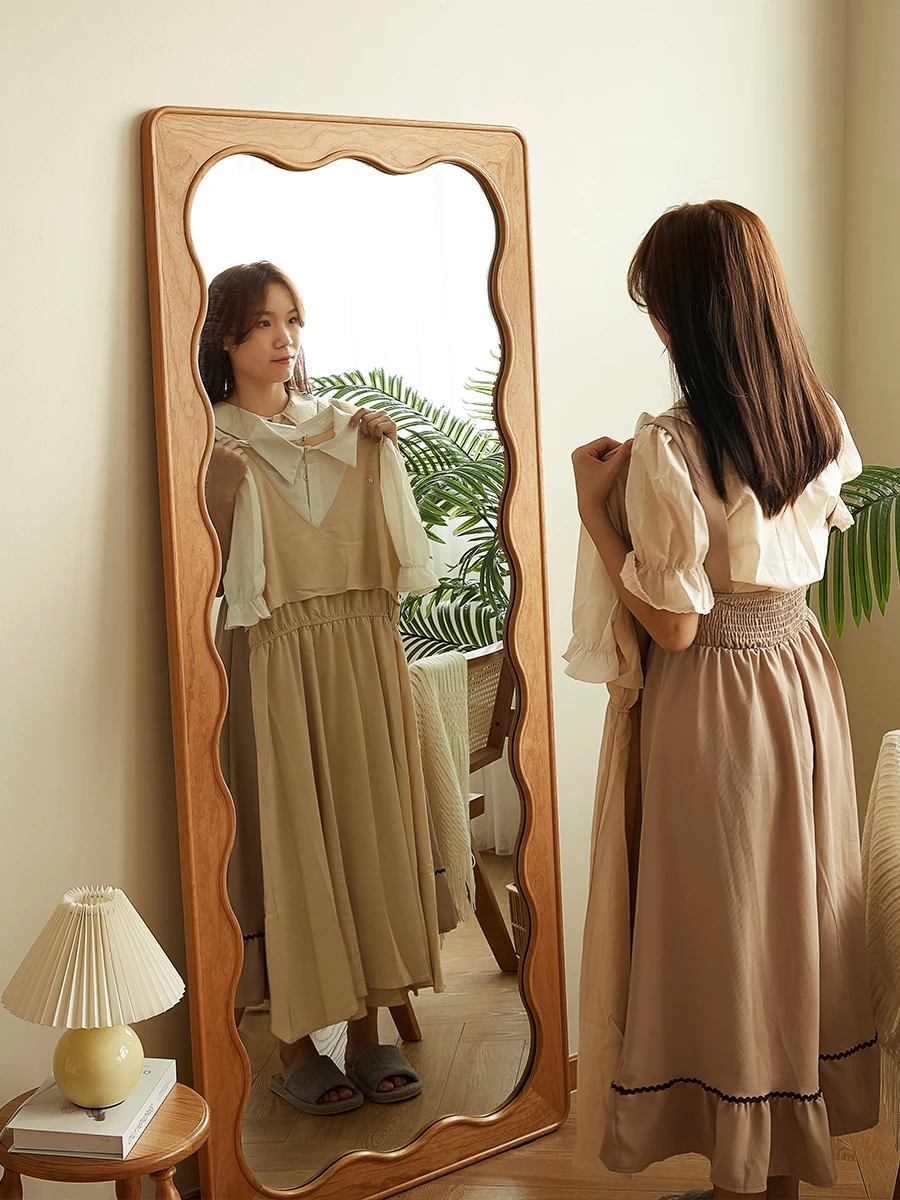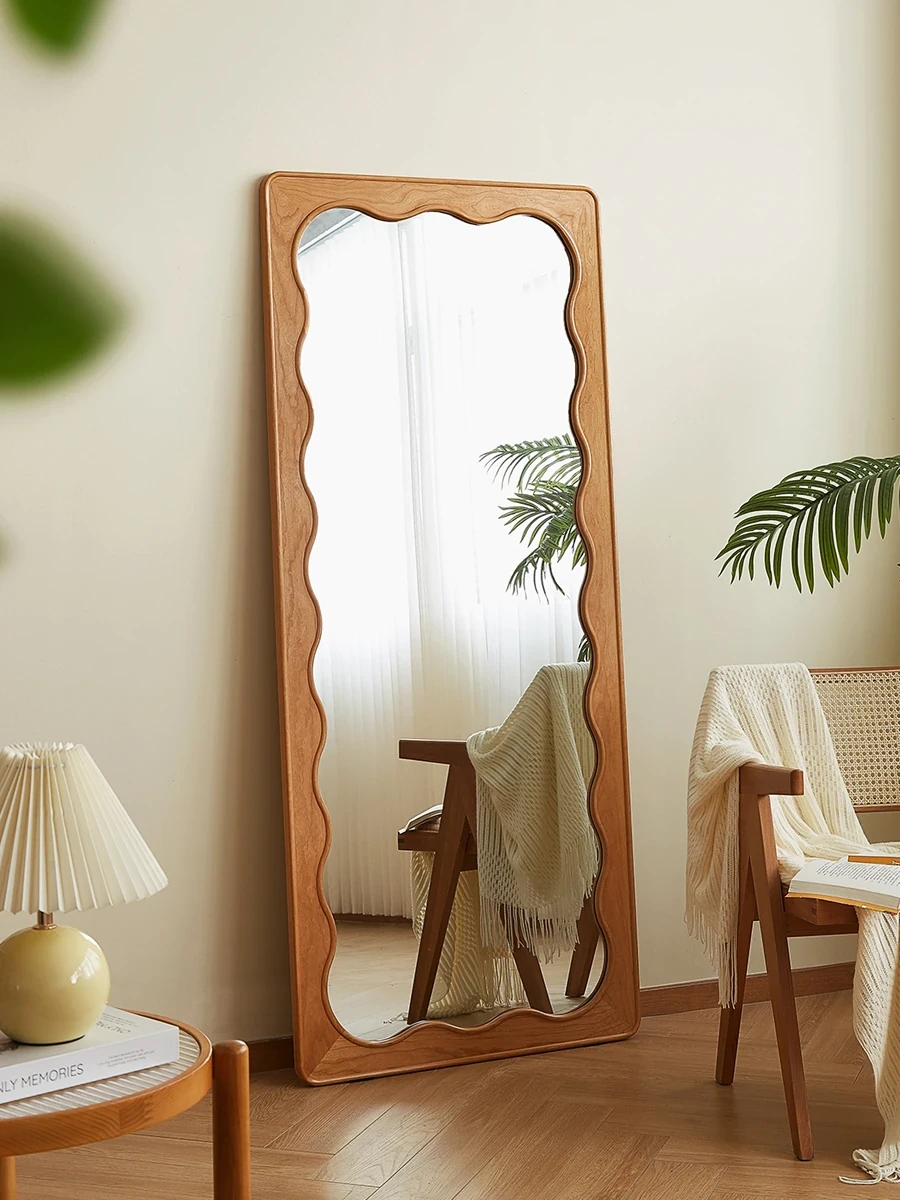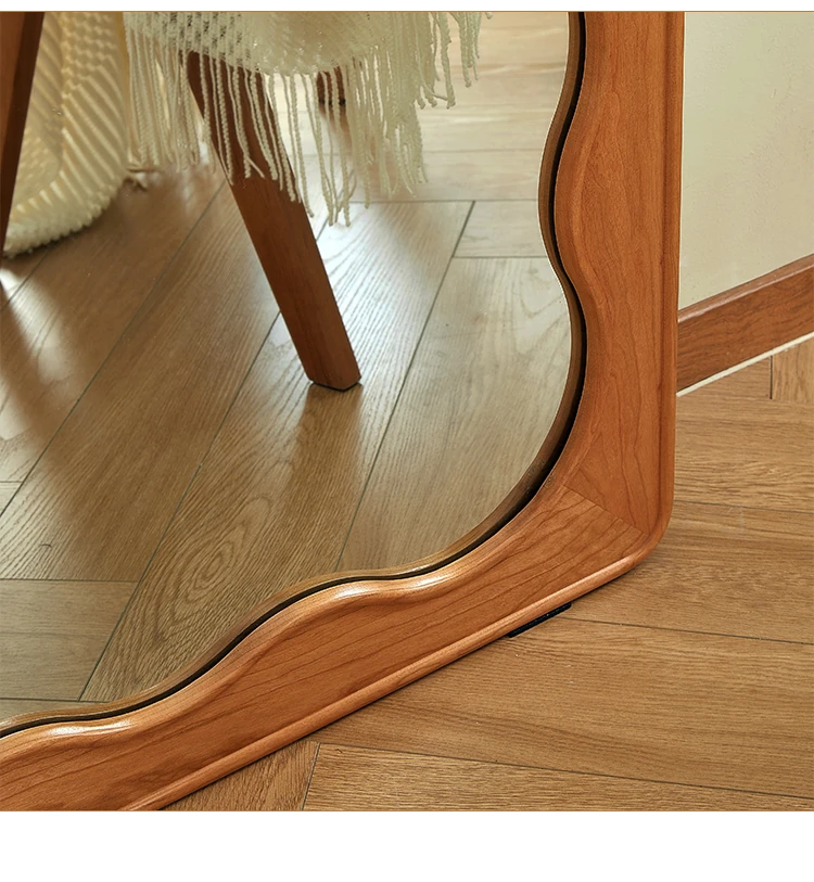 French Style Full-Length Floor Mirror - Solid Wood, Wave Design, Cherry Wood, Trendy Dressing Mirror for Bedroom, Perfect for Small Spaces