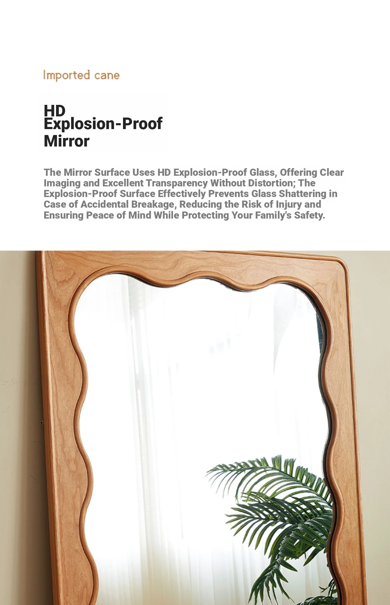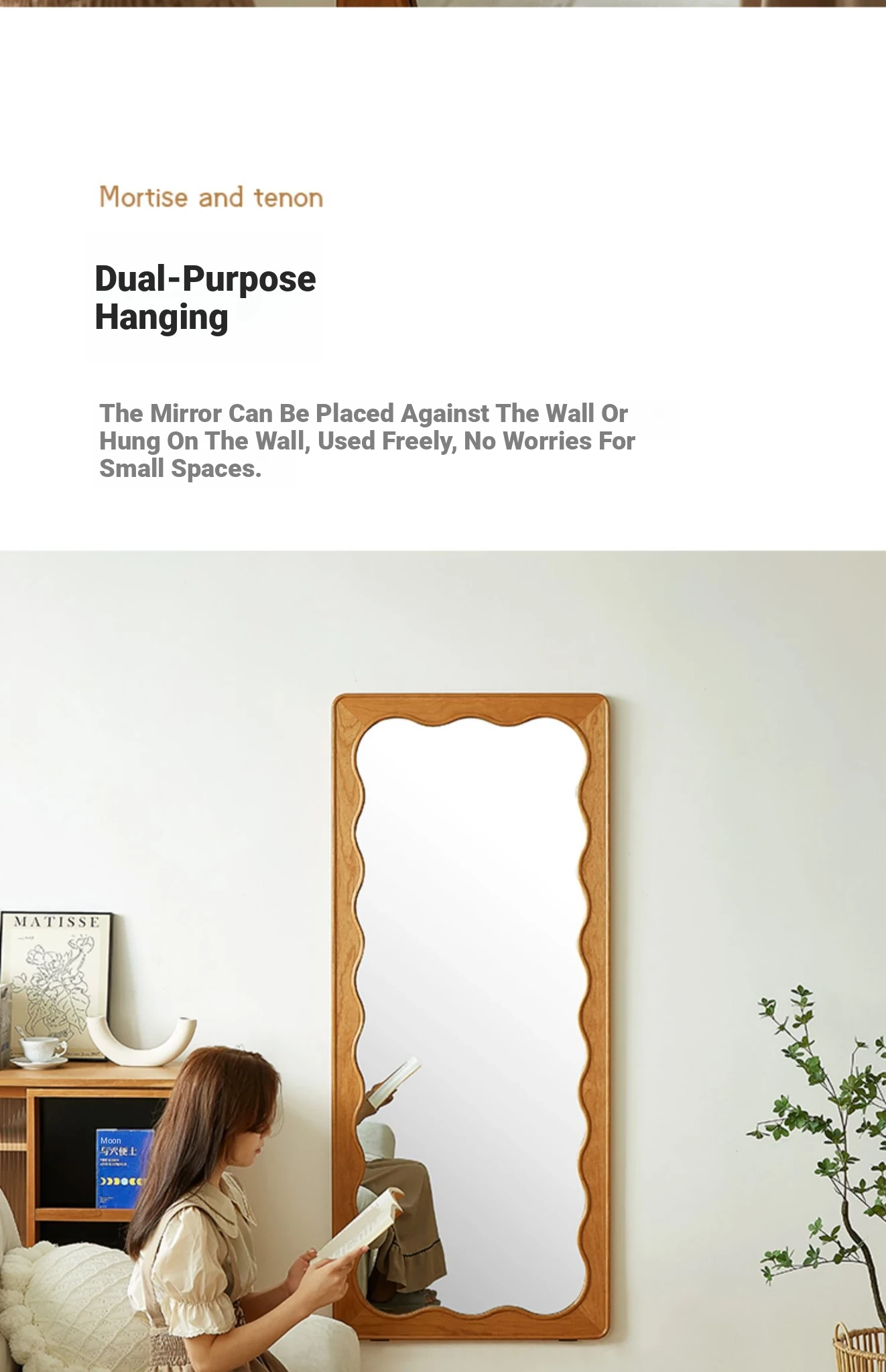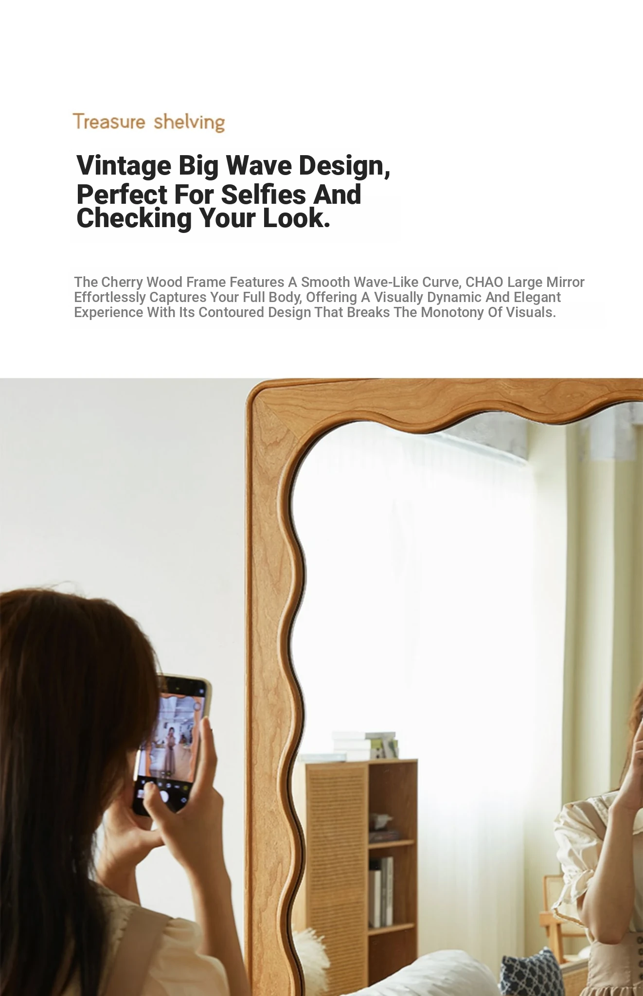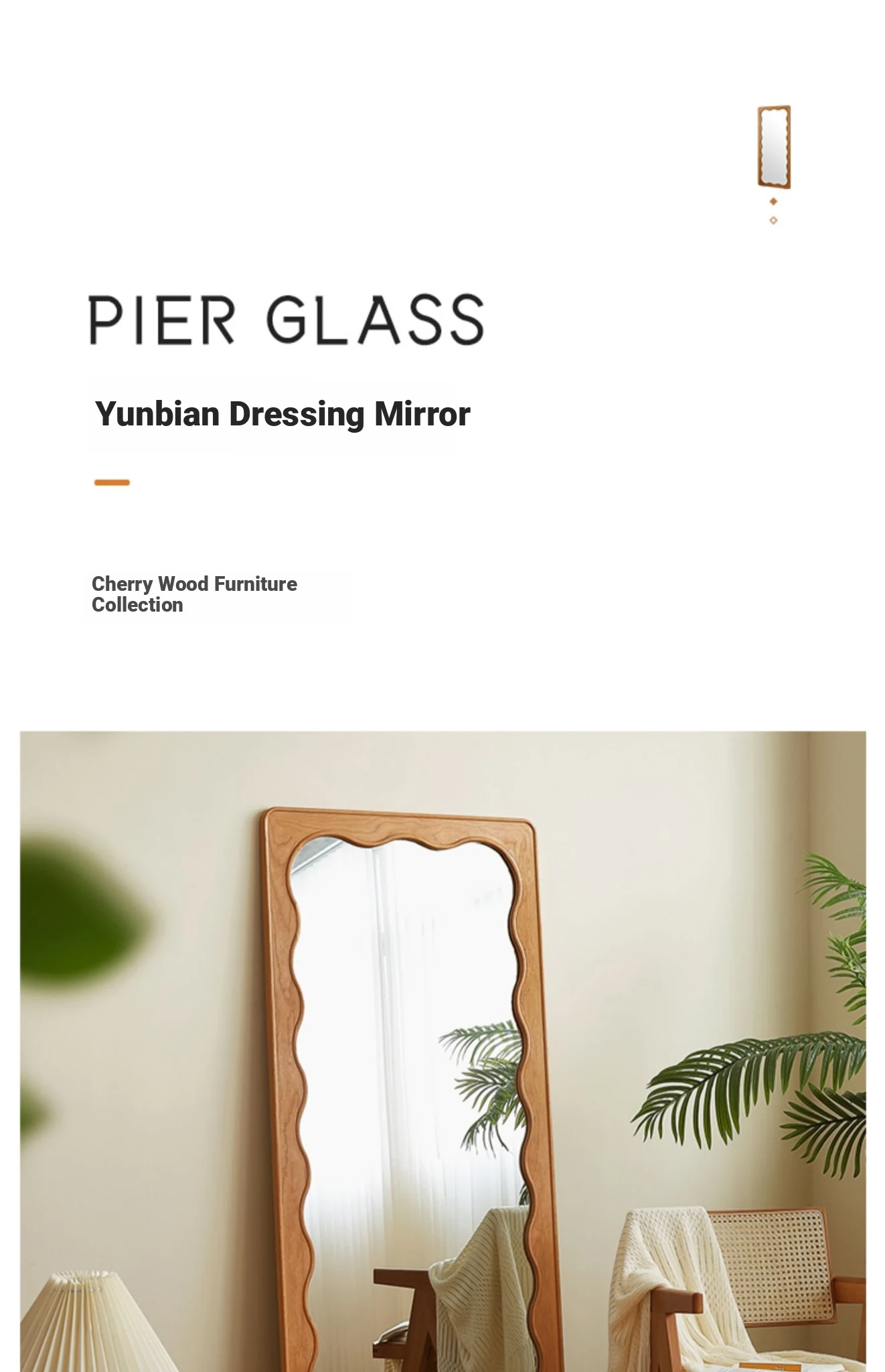 French Style Full-Length Floor Mirror - Solid Wood, Wave Design, Cherry Wood, Trendy Dressing Mirror for Bedroom, Perfect for Small Spaces