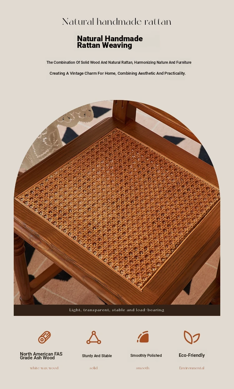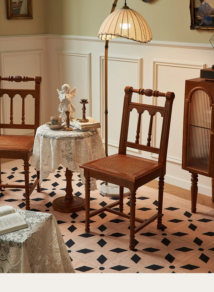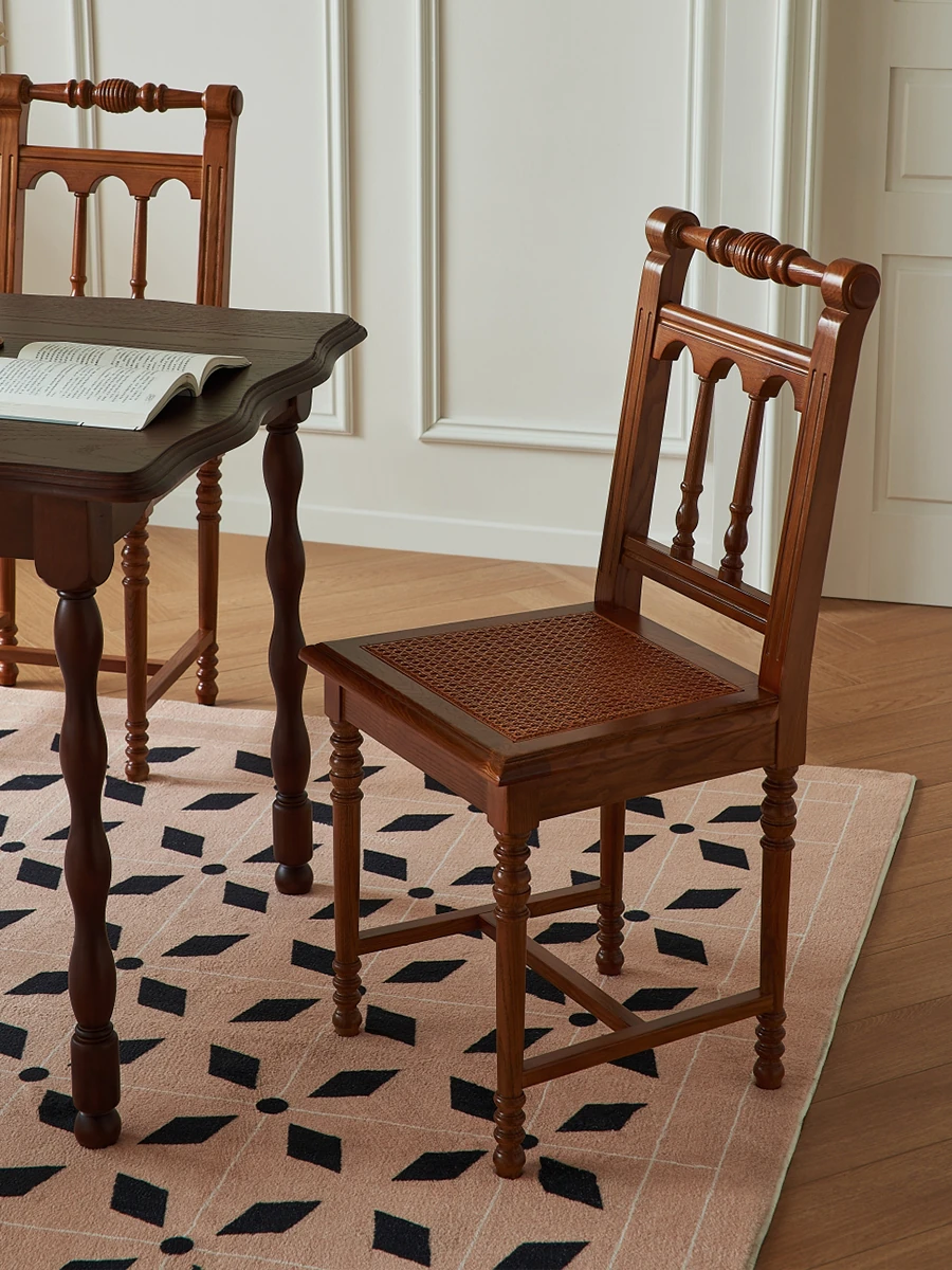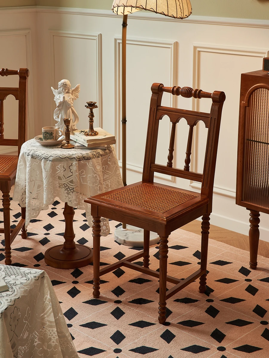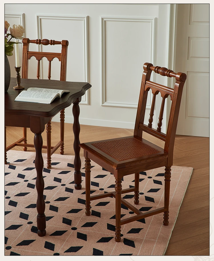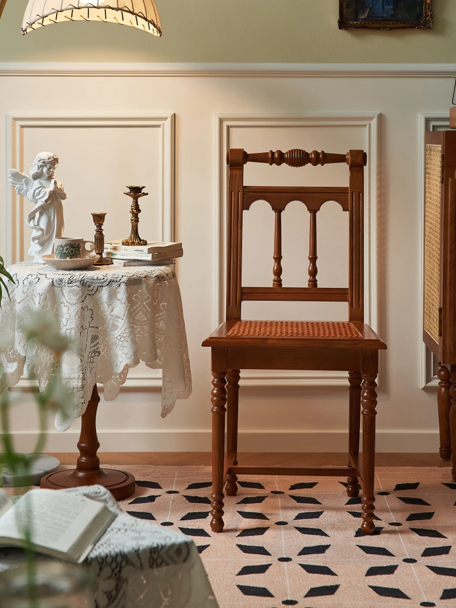 "French Vintage Solid Wood Roman Chair – Handcrafted Rattan Dining Chair for Home, Elegant Single Seat with Authentic Rattan Weaving, Perfect for Restaurants and Cozy Dining Spaces"