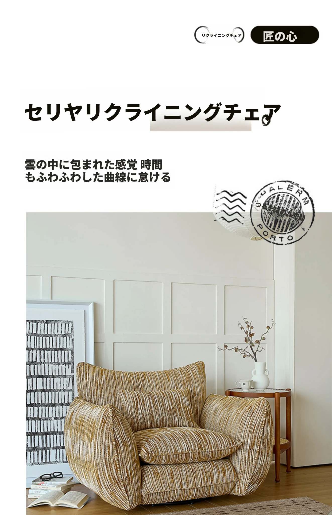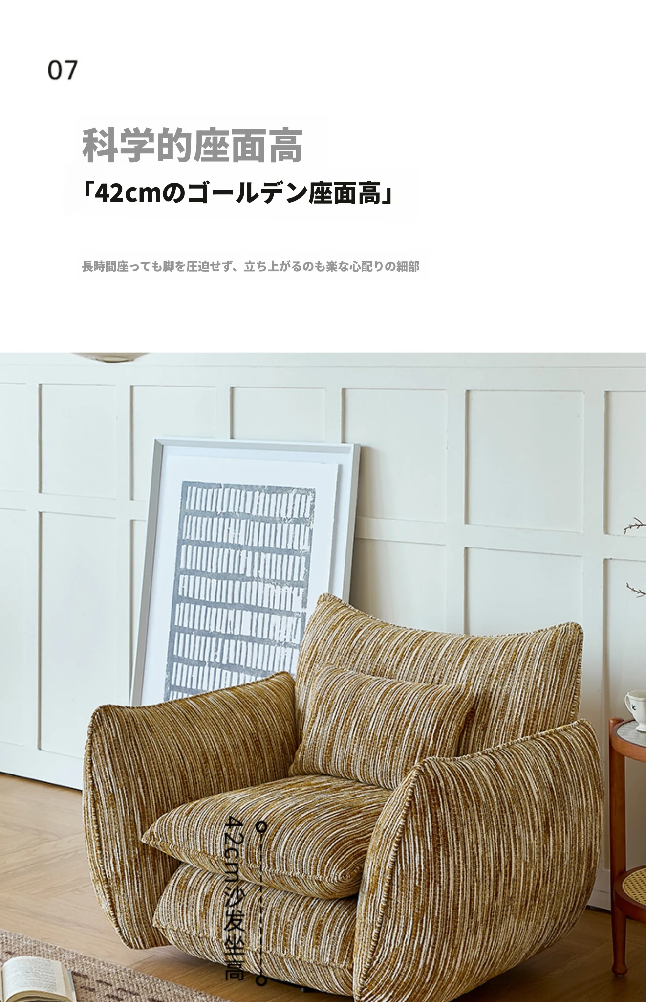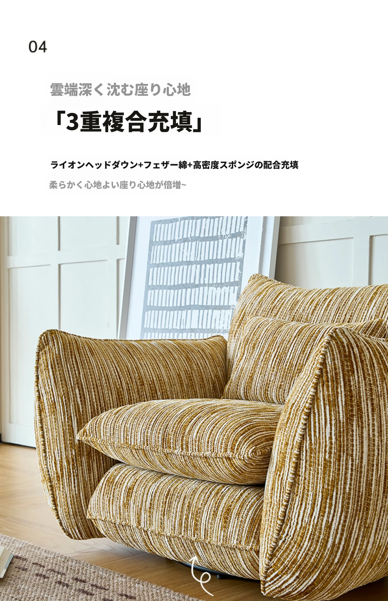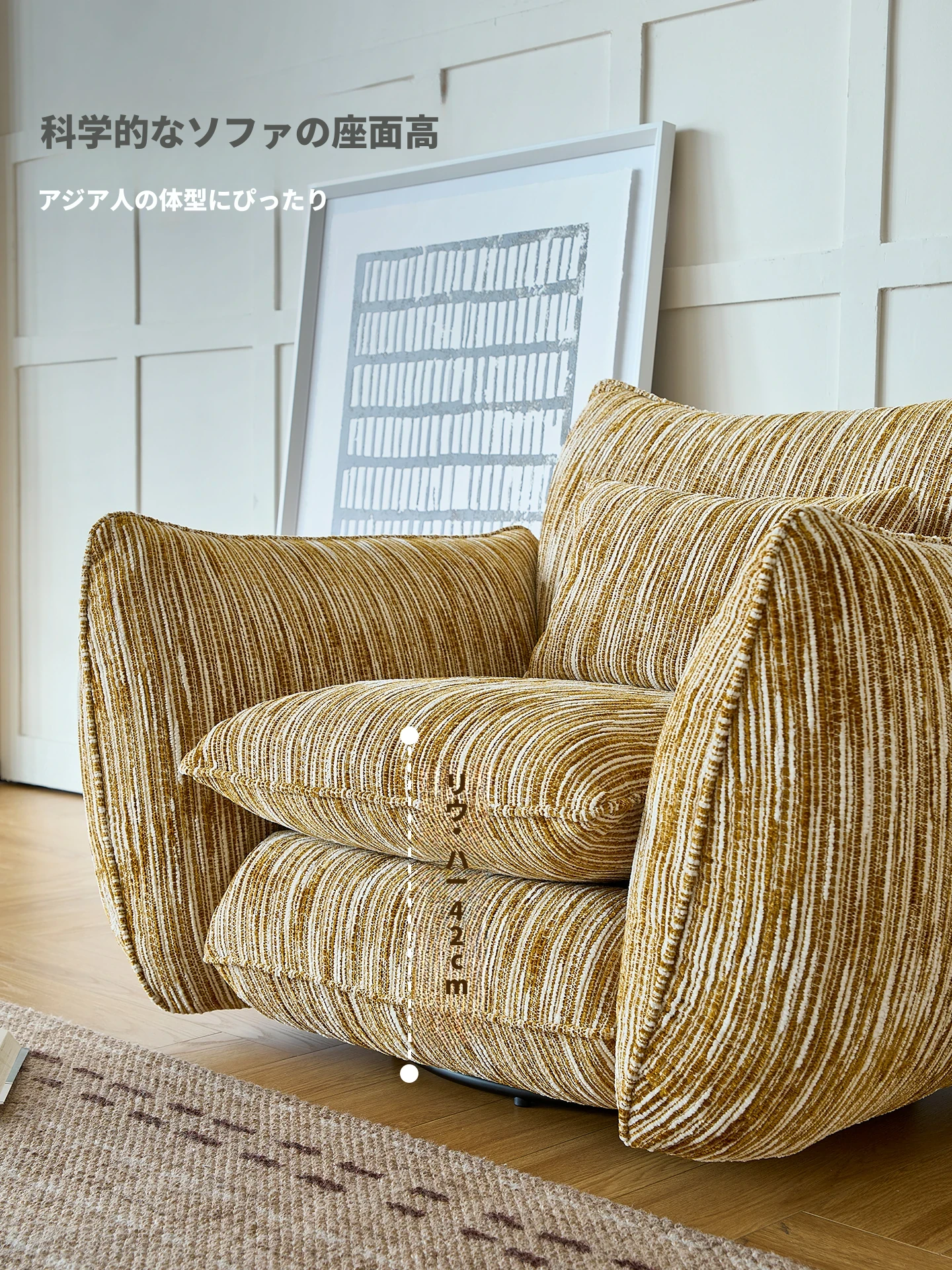 セリヤ・レトロデザインのイエローとホワイトのファブリック回転アームチェア|ラウンジに最適なリラックスチェア|独立デザイナーによる特別な一品で、居心地の良さを追求!