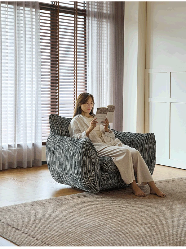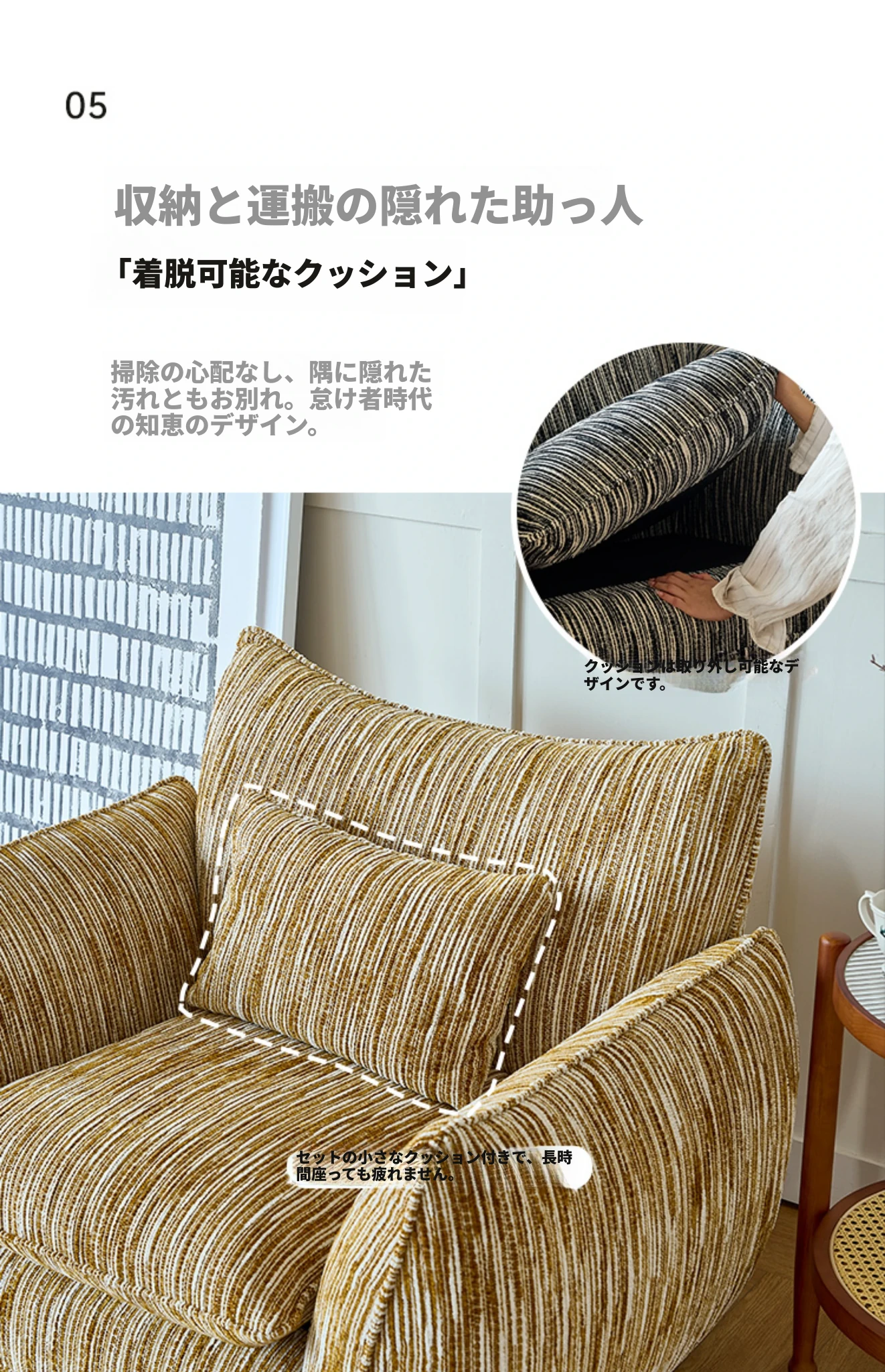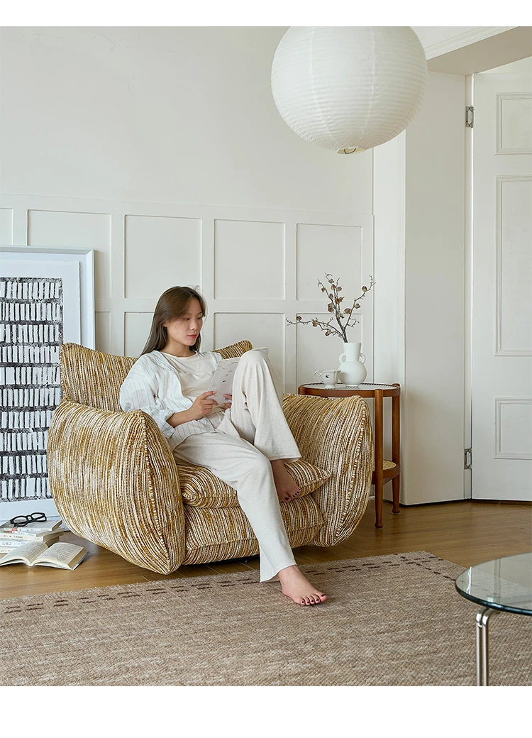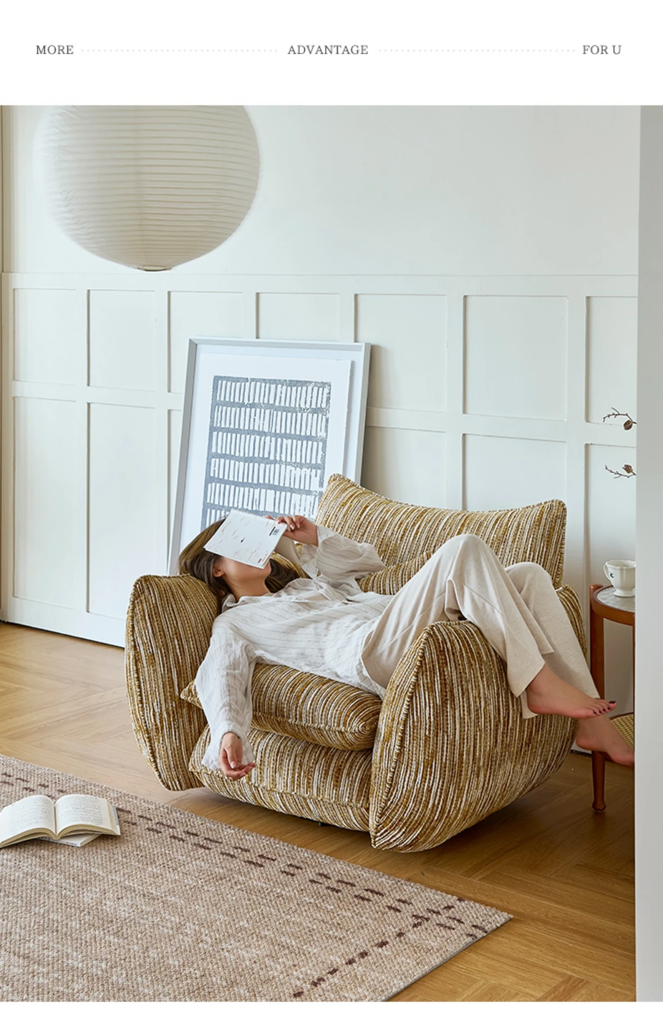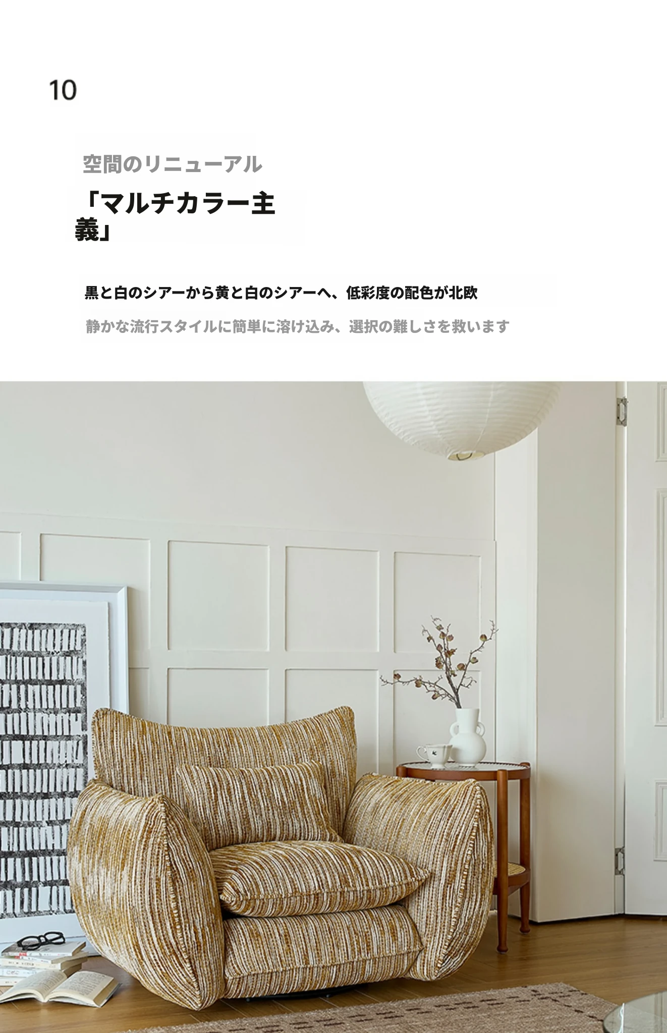 セリヤ・レトロデザインのイエローとホワイトのファブリック回転アームチェア|ラウンジに最適なリラックスチェア|独立デザイナーによる特別な一品で、居心地の良さを追求!
