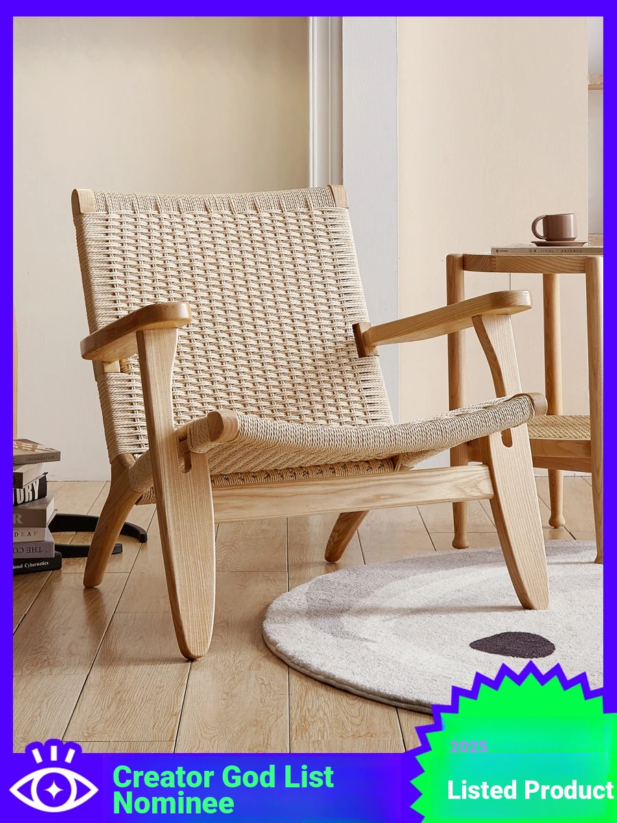 Nordic Vintage Wooden Rattan Single Leisure Sofa Chair - Designer Style Armchair for Small Spaces, Perfect for Living Rooms and Home Use