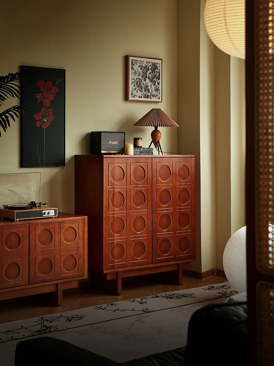 フレンチビンテージ無垢材サイドボード - リビングルームに最適な収納キャビネット、ソファの横にぴったり!おしゃれで機能的な雑貨収納、インテリアを引き立てるエレガントなデザイン。